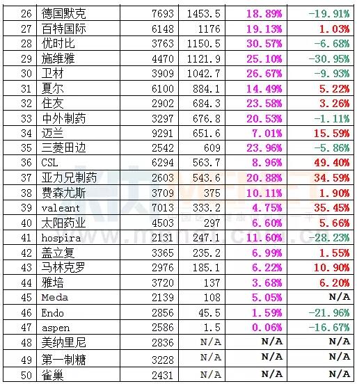 从研发费用占比看,50强企业研发费用占销售额比重较高,大部分在15%以上,罗氏、强生、阿斯利康、百时美-施贵宝、勃林格殷格翰等药企都超过20%,其中最高的是Regeneron,2015年研发投入16.2亿美元,占比高达60%。Regeneron因其黄斑变性治疗药物阿柏西普迅速成长为全球最大生物科技公司之一,其过敏试验药物Dupilumab可能同样获得成功,充分证明了,研发才是硬道理。