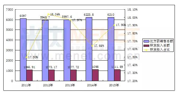 从历年统计数据看,2015年全球制药50强企业处方药销售总额出现负增长,下降13.8亿美元,从企业来看,处方药销售前9名的企业销售收入全部负增长。研发投入继续稳步增长,突破1100亿美元,跨国药企对研发的重视程度并未削减。