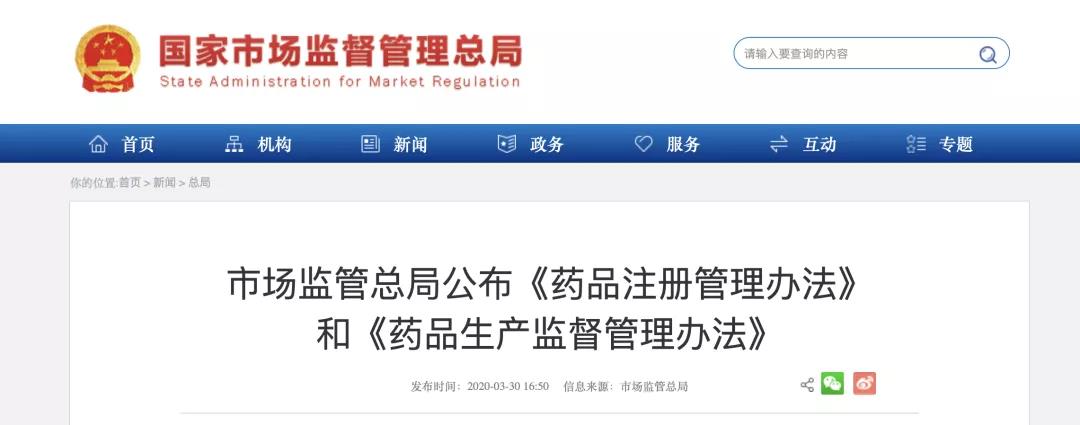 3月30日,市场监管总局以总局27号令公布《药品注册管理办法》,以28号令公布《药品生产监督管理办法》,两部规章将于2020年7月1日起正式施行。